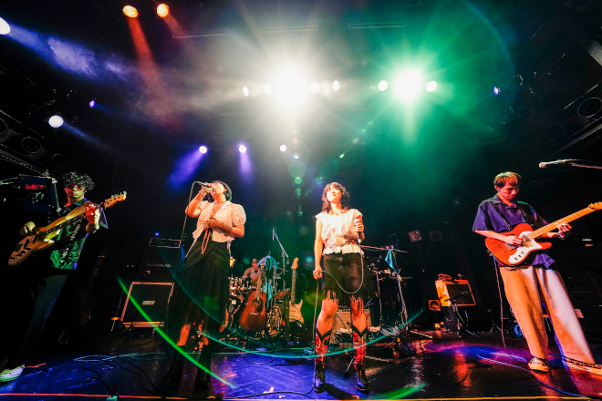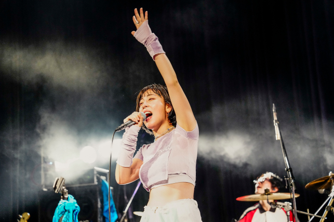 そんな熱演から「ここからはスロウなテンポで、好きに揺れて、音に乗っていってください」とコールしたのは「RED」。艶のあるLacoの歌や、色気あふれるYutaroのベースソロなど、もどかしい気持ちを抱える女性の気持ちを歌ったメロウなナンバーでフロアをどっぷり酔わせると、続く「totonoi」のしなやかなサウンドで再びフロアを揺らし始め、「yonde」が放つポジティヴで温かな光に誘われるように、たくさんの手が挙がる。そこから立て続けに繰り出されたのは「YOLO」。楽器隊のソロ回しを皮切りに、強烈なグルーヴでフロアを席巻していくと、そのまま本編ラストナンバーへ。曲の冒頭で、客席を見渡しながら「泣きそうになってきた……」と、Lacoは一人ひとりに語りかけていく。