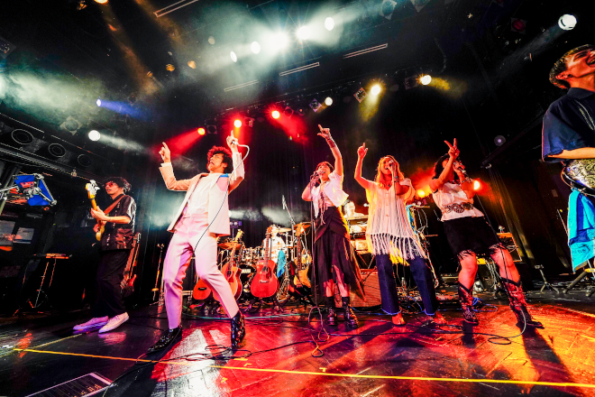 アンコールの拍手に応えて再び登場すると、ツアーの思い出話を繰り広げた後、これからもいろんな思い出をみんなとたくさん作っていきたいと語り、「最大級の愛と感謝を込めて」と、「百花」を披露。ときに軽やかに、ときに感情を爆発させるようにOtakeがドラムを叩き上げると、客席にいる一人ひとりに歌いかけていたLacoが、曲の後半で「あかん! この曲、カメラで撮ってOKって言うの忘れてた!」と思い出す微笑ましい場面も。最後にはこの日のゲストが全員登場し、「(this is the) DAY」でライヴを締めることに。全ボーカリストが声を響かせ合い、フロアから大量の手が挙がる、なんともハッピーなエンディングとなった。