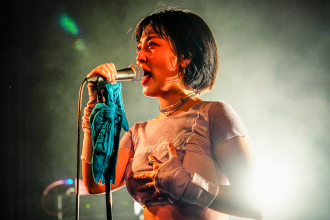 間髪入れずに突入した「ON」もとにかくパワフル。そもそもEOWの楽器隊が放つグルーヴはとんでもなく強烈で凄まじかったのだが、それがより強靭なものになり、演奏の切れ味も格段にアップ。客席の隅から隅までひとり残らず引っ張っていくLacoの歌やパフォーマンスも求心力がとてつもなく上がっていて、今回のツアーがいかに充実していたかを強く感じることができた。また、今年に入ってから発表された楽曲群も立て続けに披露。「EOWの羽生えソング」という前置きから届けられた「NEO」の開放感がフロアに満ち満ちていくと、「ベール1枚脱いでもらっていいですか!?」と「Unveil」へ。ラテンフレーバーのあるダンサブルなサウンドで、フロアを強く揺らしていく。一転「ぜんぶぜんぶ」では、胸に湧き上がる後悔や悔しさを爆発させながら、自分らしく、あるがままに生きていきたいと、エモーショナルな歌を届けた。