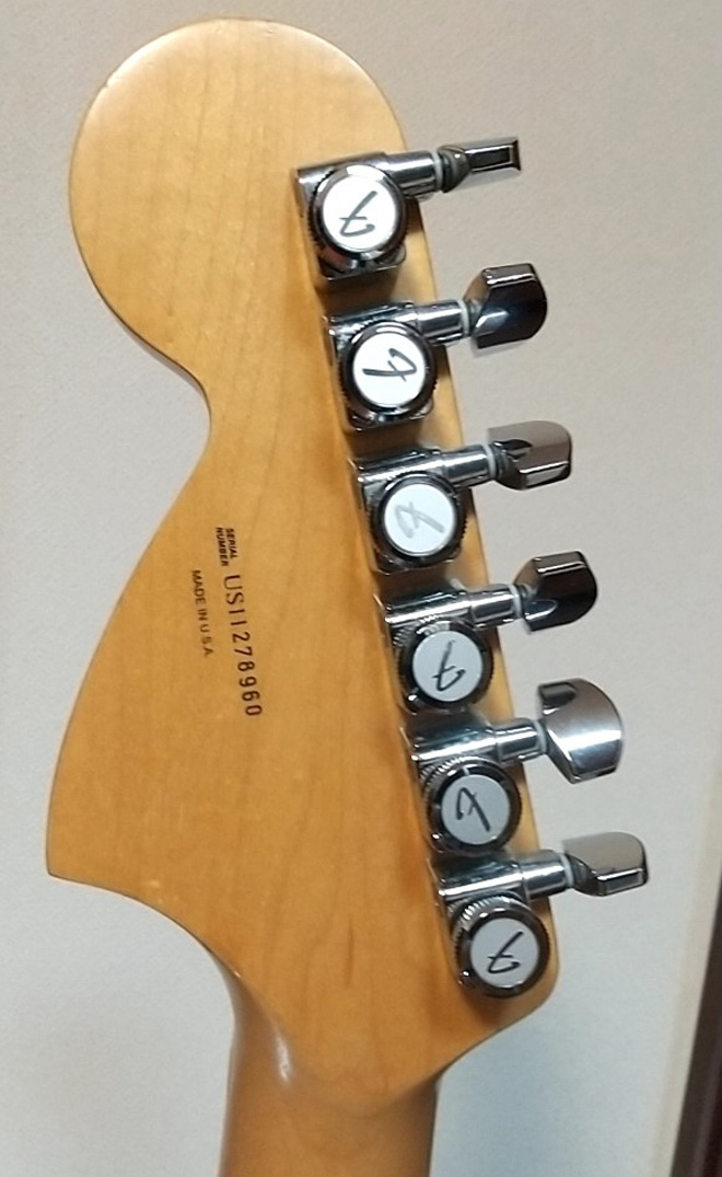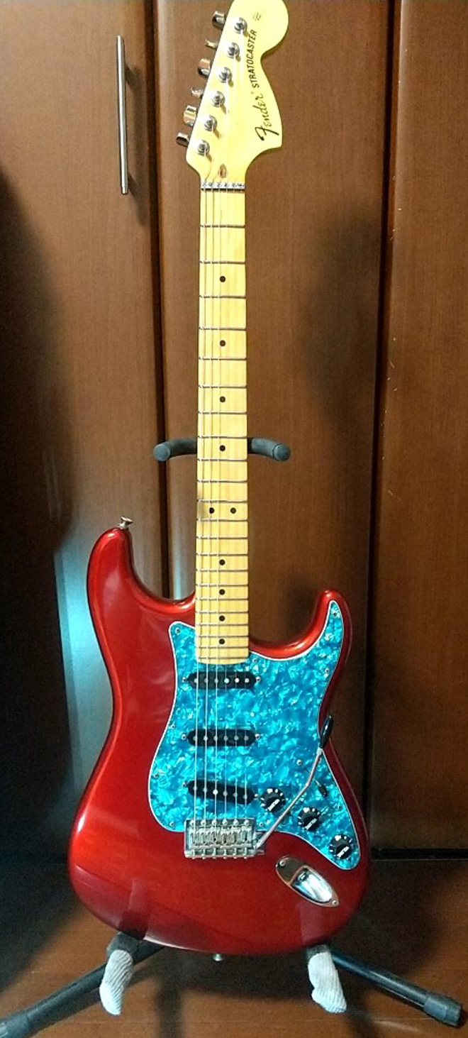 FENDER 三姉妹の末っ娘。本チャンUSA 2011年モデルです。キャンディアップルレッドのストラトが欲しくて購入。手始めに、FENDERロックペグとローラーナットを装着。製品自体は問題ないのですが、ラージヘッドの重量がさらに増えて、エッジ効きすぎ・・・。ローラーナットは既存のナット溝をゴリゴリ広げたのでもう後戻りできず・・・。純正テキスペがキレキレすぎて手に負えない状況・・・。