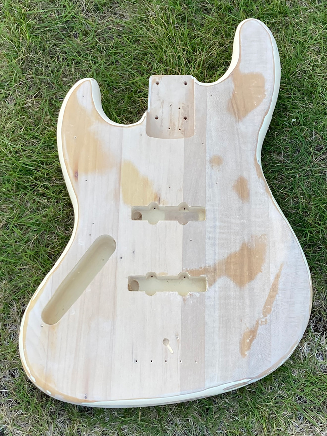 しばらくは、メインで使っていたFender deluxe アクティブで遊んでいましたが、切断当時、レフティなら弾けるかもしれないと購入したものの結局、ピックに伝わる振動で弾く事も叶わず、処分も出来なかった。レフティをどうにかしたいと思い、リフィニッシュを決めました。自家塗装なので天然のレリック?!感でラメの気恥ずかしさを若干中和できた所が、気に入っています。アースを追加しましたが、改造したい気持ちを抑えパーツは、ほとんどオリジナルのままで組みました。