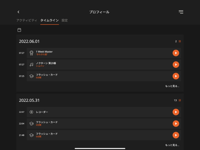 「タイムライン」機能では、その日の演奏時間や練習内容が表示されるので、日々の成果が一目瞭然。また、1日の練習の目標時間を設定することもできるので、モチベーションアップにもつながる。「レコーダー」機能で自分の演奏を録音して、客観的に聞くことも可能。アプリ上に保存すれば、いつでもどこでも聞き返すことができる。