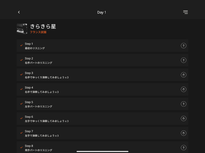 ピアノ本体の内蔵曲をタブレットに譜面表示すれば、弾きたい曲にすぐに挑戦。クラシックやポップス、レッスン曲など、多彩なジャンルの曲から好きな曲を選んで練習することができる。1週間程度で1曲を練習するプログラム「One Week Master」も搭載しているので、リスニング、右手パート、左手パートと順番に練習することで、初心者でも独学でピアノに取り組みやすくなっている。