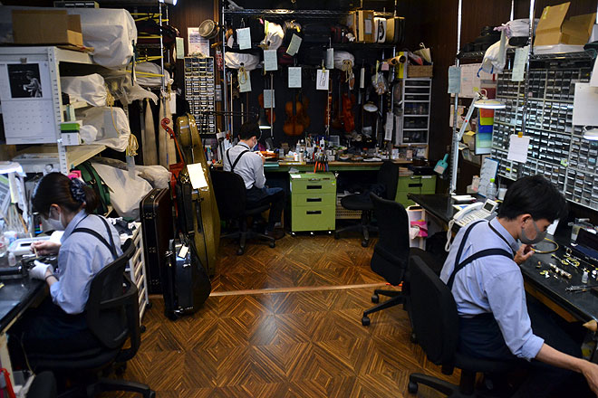 ▲管弦打楽器のリペア作業は、4Fリペアセンターで行われている。部屋はガラス張りなので、リペアの様子を外から見ることができる。ヤマハ銀座店に行ったら、楽器といっしょにこちらもチェックしてほしい。