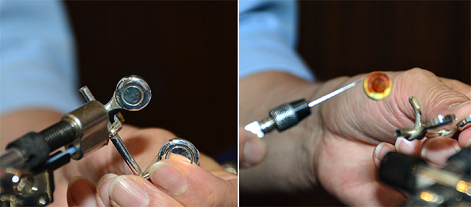 ▲カップをバーナーであぶってシェラックを溶かして古いタンポをはがす。