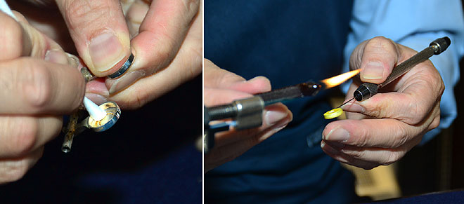 ▲カップを綿棒にきれいにしたら、新しいタンポの側面に穴を開けておく(タンポが熱で膨らむのを防ぐ空気穴)。シェラックをバーナーで溶かして……。