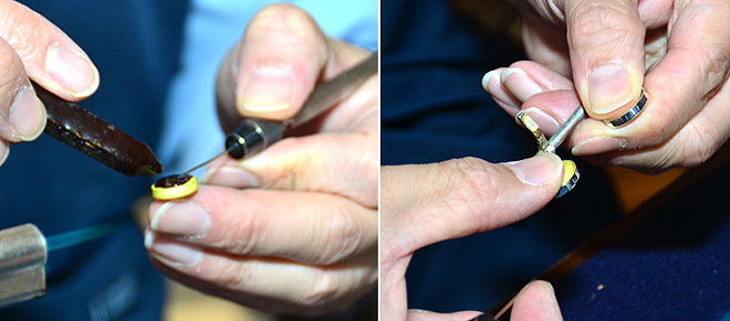 ▲溶かしたシェラックを新しいタンポにつけたら、カップに入れて指で押し込む。