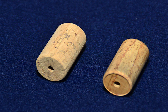 ▲新品のコルク(左)と使用済みのコルク(右)。大きさや表面の質感がだいぶ異なる。
