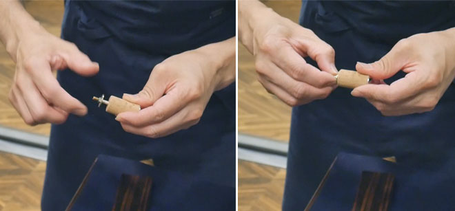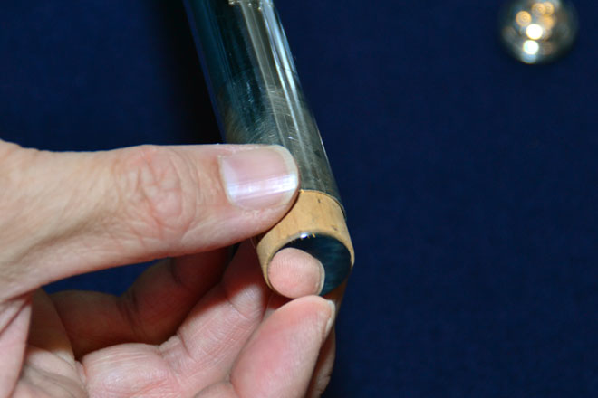 ▲コルクを頭管部に入れていく。
