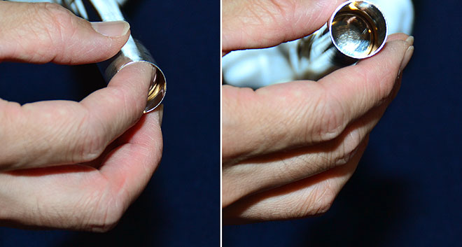「縮んで小さくなってしまったものですね。吹くところに一番近いので水分を含んで縮んだりします。水分を含むと膨らむのですが、それを繰り返して乾燥したときには縮んでいきます。新しいものは少しきつめに作られているので“なまし”ます。「なます」と言うのは、クラリネットの巻いたコルクでやったのと同じです。こういう感じで……。」