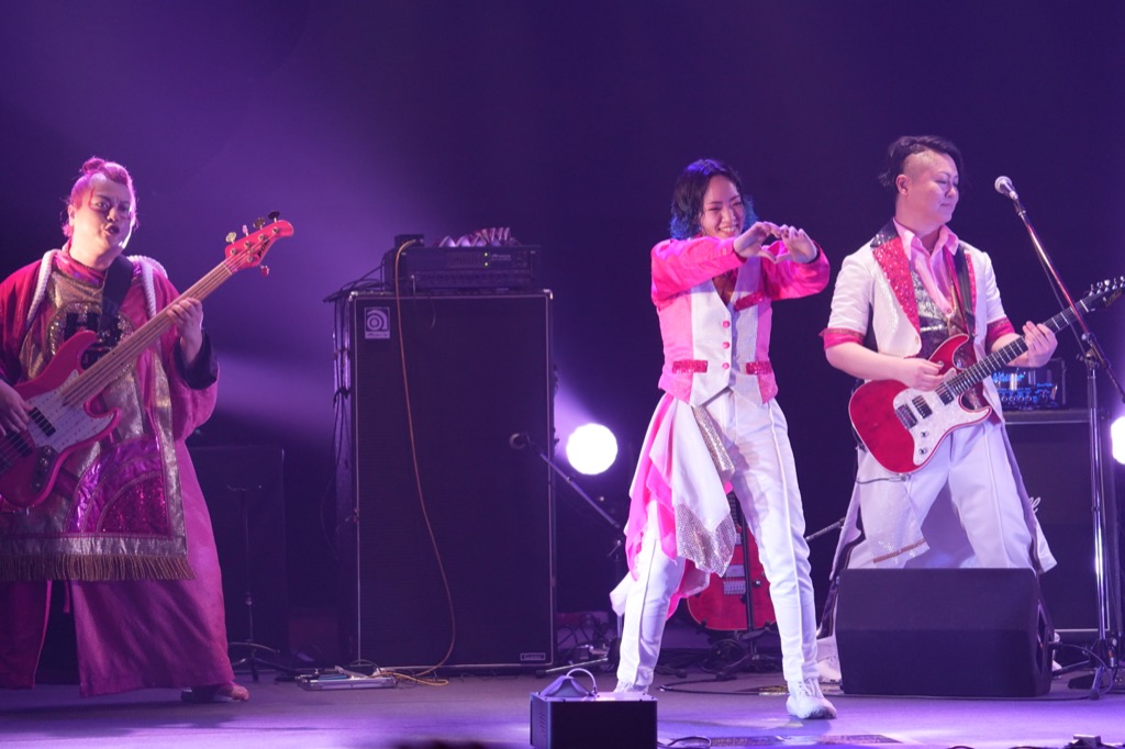 江夏、そして蕪木のツインボーカルに対して“ケチャ”をして盛り上げていく矢島銀太郎(Ba.)、翌桧ダンク冬雪(Pf.)、佐川ネル秋吉(Dj.)3人。