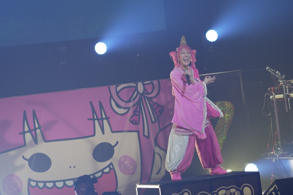 ネル&ダンクのパフォーマンスタイムが終わると奥にあるステージが、2m近い高さまでせり上がる。そのステージ前面の壁には蕪木のイラストと「97」の数字が添えられており、蕪木誕生祭ムードがさらに色濃く会場全体へと広がるさらに矢島、江夏、そしてセリから蕪木も登場し、ライブ後半戦となる“ハッスルトランスタイム”へと突入する。