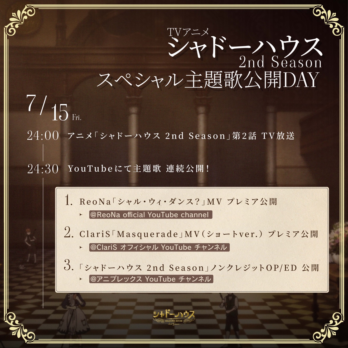 また、アニメ第2話放送後の24:30からは「スペシャル主題歌公開DAY」と称し、オープニングテーマ曲のReoNa「シャル・ウィ・ダンス?」MV、エンディングテーマ曲のClariS「Masquerade」MV、「アニメノンクレジットOP/ED」が連続で公開されることが発表されている。動画公開後は「#シャドーハウススペシャル主題歌公開DAY」のハッシュタグでも盛り上がってほしい。