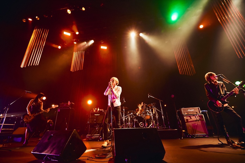 ライブは新作アルバム『伝説の夜を君と』の収録曲を軸にしながら、これまでに発表してきたナンバーを織り交ぜていく構成。序盤はオープニングの「A」から「Dancing Zombiez」になだれ込み「クレイジー・ギャンブラーズ」「狂乱天国」などテンションの高い楽曲を立て続けに披露していく。軽やかにステップを踏みながらグルーヴィーなベースラインを響かせるHISAYO(B)、肉感的で迫力あるビートを叩き出す渡邊一丘(Dr)、涼し気な様子で芯の太いギターサウンドを鳴らすアオキテツ(G)、そしてセンターに立つ佐々木と、4人のアンサンブルがひとつの塊になったようなエネルギーを放つ。