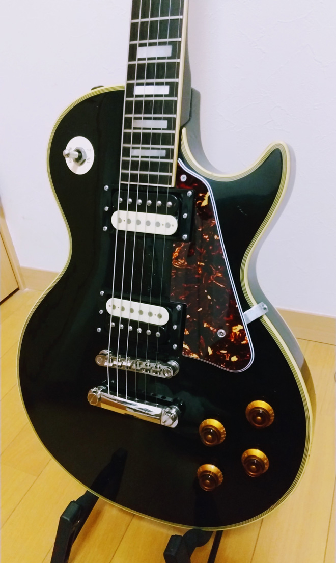 汚れを落とし壊れたパーツを交換しました。ピックアップはオリジナルのマクソン製の物がついていましたが、好きな音ではなかった為、交換することに。ダンカンやディマジオではありきたりで面白くないので、日本の老舗ゴトーピックアップ製のHB-Classicに交換しました。クセの無いピックアップですが、ホローボディーのため独特な音を奏でてくれます。見事に復活し見た目も変わり(もはやレスポールカスタムには見えませんが)僕の相棒として復活してくれました。