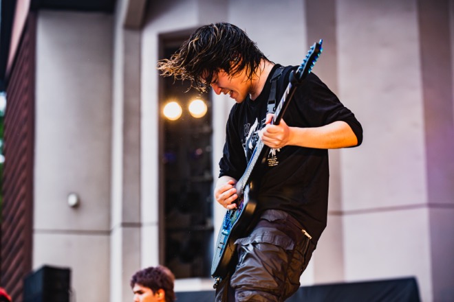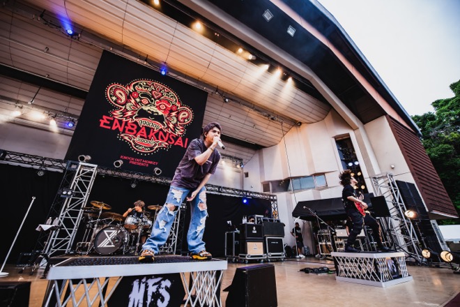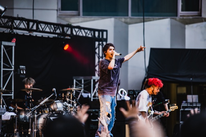 「楽しんでいこうか!」──Hiro(Vo)が観客席に声をかけ、MY FIRST STORYのライブは「アンダーグラウンド」でスタート。R&Bとラウドロックのミクスチャーに歌謡曲を思わせるメランコリーを落とし込んだミッドテンポナンバーを、Hiroのハスキーな歌声の魅力をじっくりと聴かせながら演奏したステージの4人は、そこから40分間、全8曲をたたみかけるように繋げると、日が陰ってようやく涼しくなり始めた音楽堂の気温をどんどん上げていったのだった。
