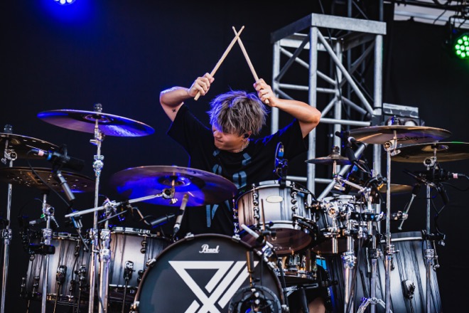 同期で鳴らしたストリングスの音色を切り裂くようにTeruがギターリフを閃かせ、バンドが披露したのは、エモーショナルなロックナンバー「REVIVER」。中盤にフィーチャーしたHiroのラップに観客がヘッドバンギングで応えると、バンドの演奏は一気に白熱。