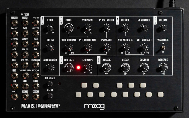 エネルギッシュな機能を持つMavisは、Moogのセミモジュラー・セットアップやユーロラック・システムと相互に接続することができ、音作りを強化できるよう設計された。44HPのシンセサイザーとしては、2つのオシレーター、フルADSR、ラダー・フィルター、サンプル + ホールド、ウェーブ・フォールディング、アッテネーター、ミキサー、マルチなどにより、複雑なミュージック・アレンジメントにおいて非常に優れた価値を発揮する。