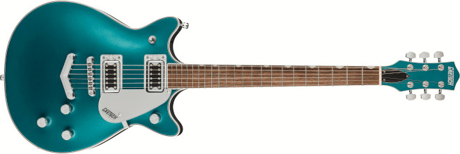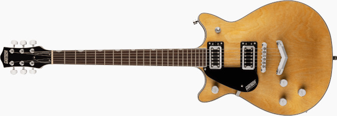 「G5222 Electromatic Double Jet BT V-Stoptail」は、ダブルカッタウェイのチェンバードマホガニーボディとアーチドメイプルトップのトーンウッドコンビネーションにより、豊かなローエンド、明確かつシルキーなハイエンド、そしてふくよかなミッドレンジに特徴付けられるJet BTトーンが特徴。