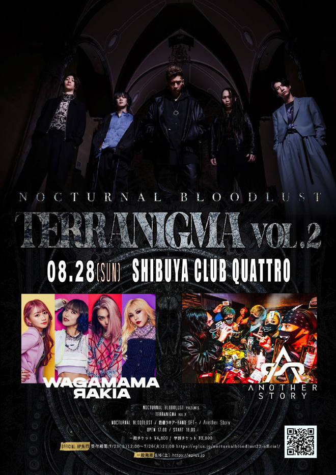 NOCTURNAL BLOODLUSTが8月28日に東京・SHIBUYA CLUB QUATTROで開催する<TERRANIGMA Vol.2>に、我儘ラキア-BAND SET-とAnother Storyが出演することが決定した。