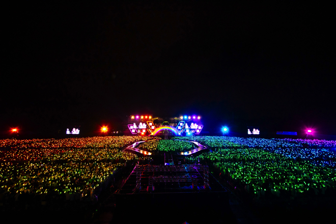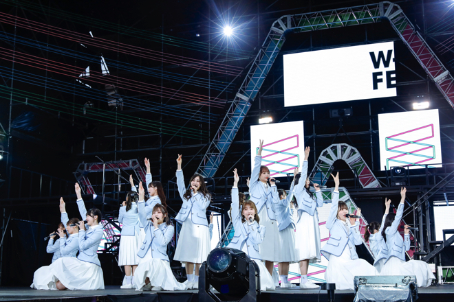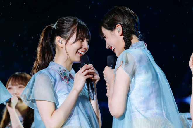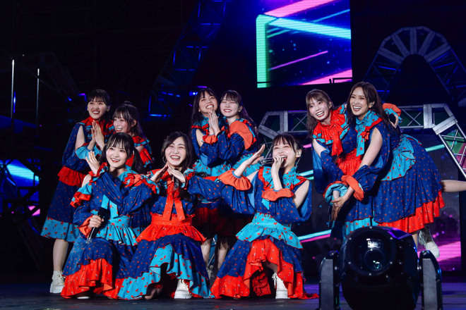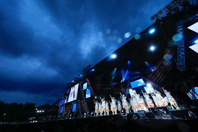 ハッピーオーラに満ち溢れた序盤から一変、日が落ち始めた中盤では「川は流れる」「飛行機雲ができる理由」と、比較的落ち着いたトーンの楽曲が繰り出される。そして、最新シングル「僕なんか」ではステージ前のウォータースクリーンを使った幻想的な映像演出とともに、センターの小坂を中心とした情熱的なパフォーマンスや楽曲の持つ切なさが強調され、さまざまな持ち味で観る者を魅了していく。