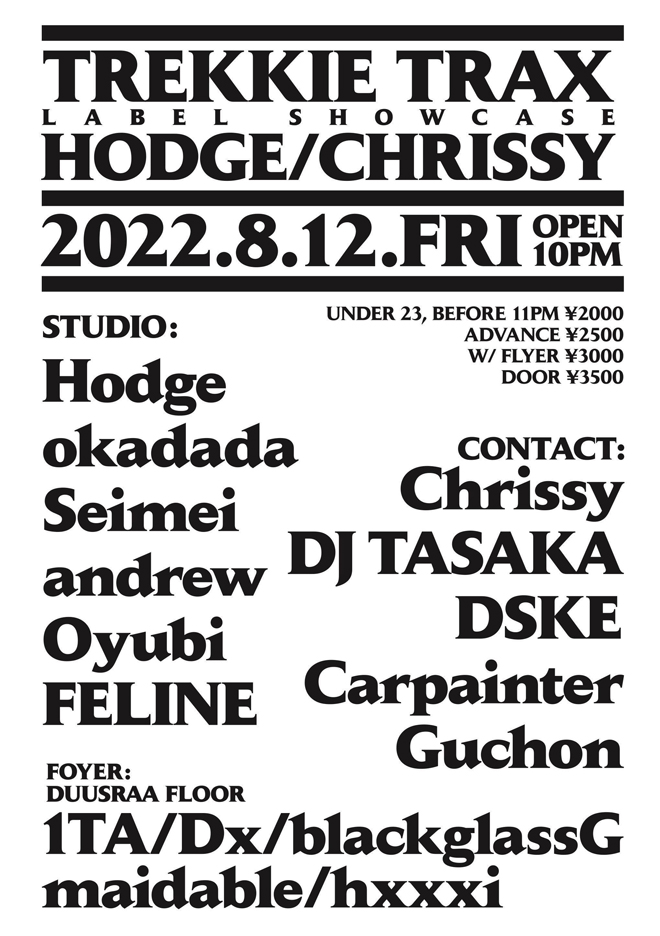 StudioXで共演する、TREKKIE TRAXのSeimeiとandrewは、ベンUFOとの交流から実現したRince FM「Hessle Audioka」のプログラムへのミックス提供や、ジャイルス・ピーターソンによるWorldwide FMでのマンスリー・プログラム、さらに、カナダWET TRAXや、先日、TREKKIE TRAXリリースされた、Seimeiの2枚の優れたテクノアルバムで、グローバルな評価をより確固なものへと更新している。先述のRince FMにも出演したジューク/フットワークプロデューサーOyubiや鬼才okadada、独自のベース/レフトフィールドサウンドを有するFELINEといったエリートが、Hodgeとの相乗効果を引き出す高熱のフロアが実現した。