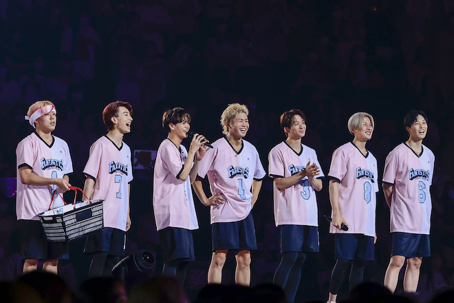 最終日、4日目の『BATTLE OF SUMMER』は、夏曲メドレーからスタート。甚兵衛を身に纏ったBALLISTIK BOYZが、潮風を感じる「WAVIN’」を歌いながらゆったりと外周ステージを回ると、さいたまスーパーアリーナは一気に夏ムードに包まれた。続くFANATASTICSは「Flying Fish」を軽やかに歌いながら、太陽のようなビッグスマイルの瀬口黎弥を中心に、カメラに向かって思い思いにアピール。