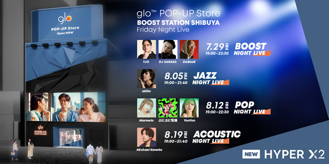 渋谷の道玄坂下交差点に期間限定でオープンするポップアップストア「gloTM hyper X2 BOOST STATION」にて 4週連続、金曜日の夜に開催される本イベントでは、それぞれ「BOOST NIGHT」「JAZZ NIGHT」「POP NIGHT」「ACOUSTIC NIGHT」と題し、毎週異なるコンセプトでアーティストを招き多彩な音楽カルチャーが堪 能できる空間を演出。20歳以上の人なら入場でき、入場は無料となっている。