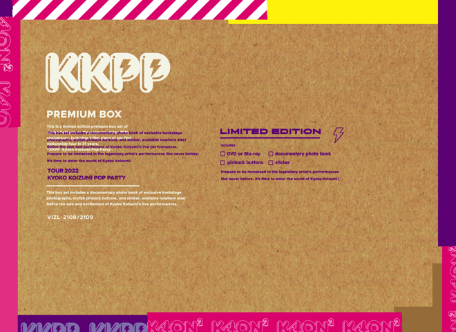 同作には31年ぶりの全国ホールツアーとなった<KKPP(Kyoko Koizumi Pop Party)>より、デビュー記念日である3月21日に東京・中野サンプラザホールで行われたライブの模様を収録。Blu-ray DiscとDVDには特典映像として、ミュージックビデオ「夏のタイムマシーン 1982-2022」とYouTubeでも公開された「KKPPツアーダイジェストトレーラー」、ツアー初日の神奈川・相模女子大学グリーンホール公演で撮影された「東の島にブタがいたVol.2」が収録されるそうだ。ドキュメンタリーフォトブックや缶バッジ、「KKPPスタッフパスステッカー」が付いた完全生産限定盤も同時発売される。