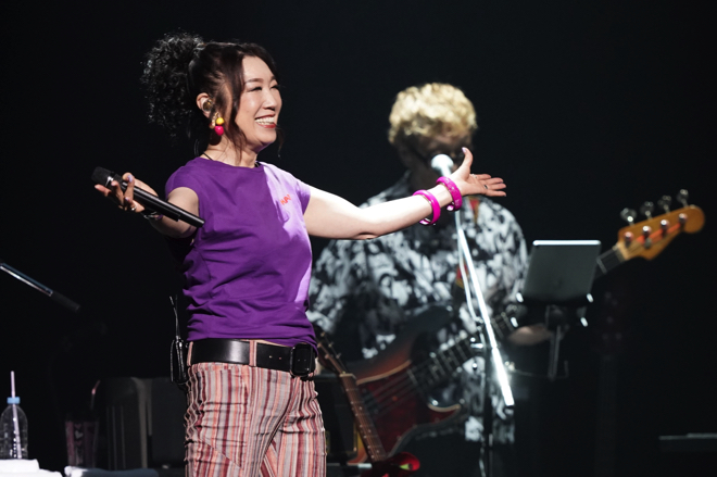 ここからは尾崎亜美のゲストコーナーに。「私のデビューのときに、プロの音楽家の扉を開けてくれた皆さんと、今日はご一緒してます」と1曲目に歌ったのは尾崎のファーストアルバム『SHADY』(1976)に収められた「私は何色」。当時のレコーディングには松任谷正隆、鈴木茂、林立夫が参加した。松任谷は1枚目と2枚目のアルバムプロデュースも担当。尾崎にとって想い出深いメンバーが再結集した。続いても3人が関わったセカンドアルバム『MIND DROPS』(1977)収録の「初恋の通り雨」を歌う。「この3人は、私の歴史の中でもとっても大事なひとたち」ですと改めて紹介。いちばん最後に尾崎の前に現れたのが夫でもある小原礼。尾崎の海外録音時、小原に参加を依頼したが断られたエピソードを披露。「でも、この4人は私の中でめちゃめちゃ濃い人たちなんです!」とSKYEのメンバーを称えラストは「19歳の頃に作った歌です。この歌で皆さんに知ってもらえるようになりました」と松任谷プロデュースのサードシングル「マイ・ピュア・レディ」を歌って、「二段目、離脱します!」と、ロケットが回転するようにクルクル回りながらステージを降りた。
