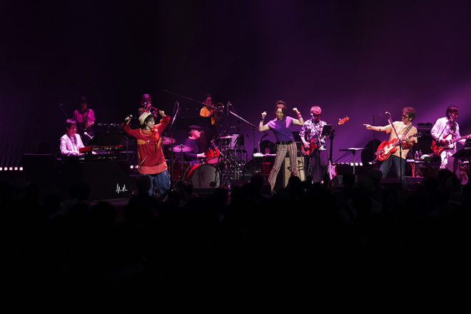 ここでステージには再び、荒井、奥田、尾崎の3人がジョイン。荒井はこのメンバーを見て「こうやって、ありえない取り合わせが揃うと、フェスのようですね!」と感激。松任谷から「最初にお話したように、このショウでしか見られないのをいくつか用意しました。次の曲でみなさんがリラックスしてくれないと、ボクの立場がないんです」と話すと、奥田は「名古屋、大阪ではこの曲をきっかけにお客さんと打ち解ける感はありましたしね」と受け、演奏されたのは「アジアの純真」〜「これが私の生きる道」〜「渚にまつわるエトセトラ」と続くPUFFYメドレー。ご本家のAmiYumiならぬ、尾崎&荒井版での“亜美由実”の登場に客席もオールスタンディングで応える。圧巻は後半。各々がひとつの曲の中で「アジア〜」「これが私の〜」「渚にまつわる〜」の歌詞を歌うマッシュアップを披露。奥田が「隣に釣られないよう気を使った」というほど、超高等テクニックだが、見事にこれを決め、エンディングになだれ込む。ラストは小原の「コロナに負けず突っ走りましょう!」と新アルバムのリード曲「ISOLATION」。豪快なロックンロールブギで場内をヒートアップさせ、そのまま奥田の「マシマロ」、尾崎の松田聖子提供曲「天使のウィンク」に荒井由実の「14番目の月」をメドレーで畳み掛け、最後は「ISOLATION」に戻って、大きな拍手の中、本編はここで終了。