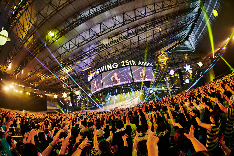 そしてラストを飾る「ACID HEAD」の、スクリーンで燃え上がる炎とシンクロする熱いパフォーマンス。それまでどっしり構えていたJIROも花道へ飛び出し、メンバー全員で全方位のオーディエンスに向き合うフォーメーションがかっこいい。「ありがとうHappy Swing。愛してるぜ!」──一番奥の一人にまで届くようにTERUが叫ぶ。音が消えても1万8000人の熱い拍手が鳴りやまない。