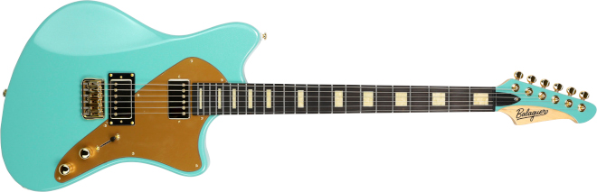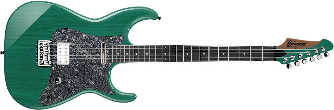 The Espada T-BAR 2.0は、オリジナルのオフセット・ボディー・デザインに26.5インチ(673.1mm)のギターで、メタルコア・バンド「THE WORD ALIVE」のギタリストであったトニー・ピズッティのシグネチュア・モデル。ボディーはマホガニーを使用し、エルボー・カットやバック・カット、ストレスのないハイフレットへのアクセスを可能にしたヒール・カット、バック側カッタウェイのスクープ・カットを採用。ネックはメイプルを使用し、プレート・レスの4点留めボルト-オン方式でボディーにジョイント。フィンガーボードはエボニーで、クリーム・パーロイドのブロック・ポジション・マークを配置。フレットには硬質なステンレスを採用し、アジャスタブル・トラスロッドはヘッド側。ピックアップは、オリジナル・ピックアップのFeralハムバッカー(ブリッジ&ネック)をマウントし、1ヴォリューム、コイルタップ・スイッチを兼ねたトーン、3ウェイ・ピックアップ・セレクター・スイッチを装備。Feralハムバッカーは厚みのあるアルニコVマグネットを使用し、高い出力の実現と同時に深みときめ細かさを持ち合わせ、Feral(=野性的な、凶暴な)の名の通りヘヴィーなサウンドにマッチしたピックアップ。激しい演奏でもチューニングの安定性が高いロッキング・チューナーを搭載。ブリッジは、ストリング・スルー・ボディー仕様のヒップショット・フィックスド・ブリッジ。1インチほどスケールが長いことで、低音のレスポンスも良く、ダウン・チューニング時のテンションもキープされる。ハードウェアはゴールドで統一し、ボディー・カラーはグロス・メタリック・クール・グリーン。