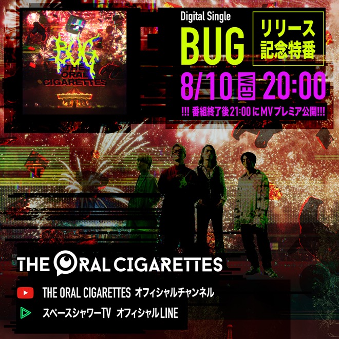 THE ORAL CIGARETTESが8月10日、新曲「BUG」をデジタルリリースする。同日21:00よりミュージックビデオのYouTubeプレミア公開が実施されるほか、その直前にリリース記念特番をオフィシャルYouTubeチャンネルとスペースシャワーTV公式LINE LIVEアカウントにて同時配信されることが発表となった。