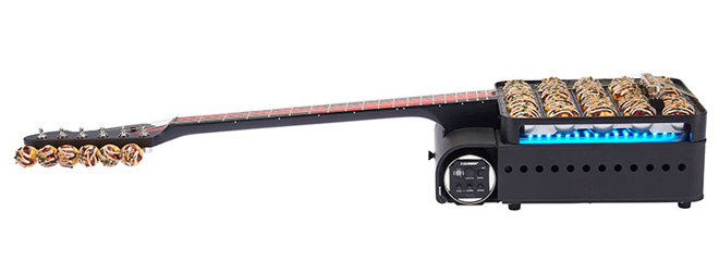 気になるギターとしての機能だが、現時点で詳細は一切不明。金属ボディであり、たこ焼きトップという構造上、通常のマグネットピックアップの搭載は難しそうなので、ブリッジ下にピエゾを仕込んでいるのかもしれない。コントロール系も詳細は不明だが、どれかのたこ焼きがボリュームやトーンを担っているのではないか。火力調整つまみがボリュームになっていると考えるのが妥当であろうか。全てのたこ焼きにプッシュ/プッシュスイッチが付いていたら楽しいのだけど、そんな無駄な機能はないだろう。