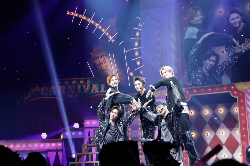 この日はWOWOWの生中継も入っているとのことで、画面越しの視聴者にも挨拶してからは、「今日は絶対忘れられない1日にしましょう」(ユーキ)と、ダンスグループとしての旨味で魅せるブロックへ。太いビートが鼓動と重なり、5人の挑発的な仕草に胸が高鳴る「Beasty Spider」、対照的に温かな笑顔に心包まれる「Four Seasons」と、種類の違う愛に満ちたナンバーで観る者の心を震わせる。「8号車の日、祭りの時間だ! だけどシートベルトは締めてください」(リョウガ)という煽りからは、今日“8号車の日”のためだけに用意されたメドレーもスタート。メンバーコールが吹き荒れる人気曲「Drive on week」で躍動すると、「一番好きなものは……8号車!」と嬉しい宣言を盛り込んだサマーチューン「Summer love」に続き、「Kiss me Baby」ではハードなダンスと画面いっぱいに広がる蠱惑的な笑みで8号車を悩殺する。さらに、中華サウンドに乗ってタカシとダンサーがバトルするカオスな「キズナアルゴリズム」、5人が振るタオルに色とりどりのペンライトが応える「浮つきWAVES」に続くサンバチューン「CARNAVAL」では、タカシの歌声もノリにノッて、夏ムードは極限までヒートアップ。14分超のメドレーをノンストップで贈って「暑い!」「夏すぎる!」と口にした5人に、客席からは大きな拍手が贈られた。「詰め込みすぎ!」とボヤいたリョウガに、このツアーでも総合演出を務めたユーキは「だって、8号車の日だからね」と即答。こんなさりげないやりとりからも、8号車に対する愛の強さがうかがえる。