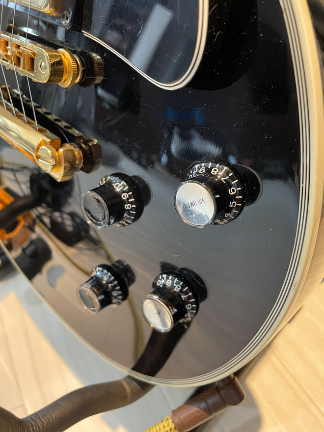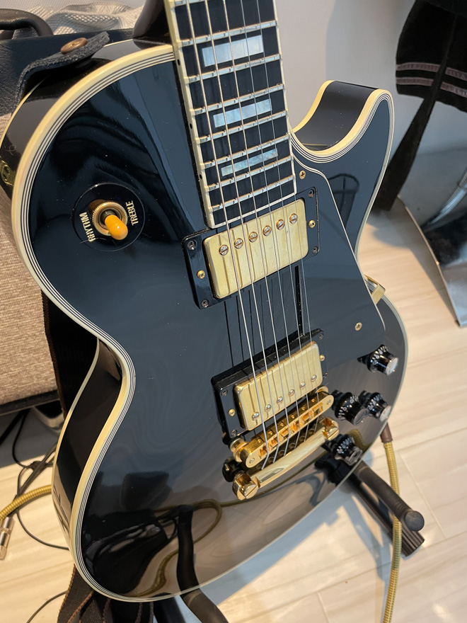 いいですね。文面からも愛情がひしひしと伝わってきます。何はともあれ、黒カスはカッコいい。私はエレキギター界で一番のイケメンだと思っています。引き締まりながらも妖艶なライン、皮下脂肪なんかまったくない鍛えまくった身体に見えるっしょ。私も1990年代の黒カスは手放すことなく手元にある大好きなギターのひとつ。前オーナーが替えたこのノブは、ピーター・グリーン~ゲイリー・ムーア…そして今はカーク・ハメットが所有しているグリーニーへの思いが入っているのかも、ですね。それにしてもギブソンはレスポールカスタムを何故レギュラーラインからなくしてしまったんでしょう。謎です。(JMN統括編集長 烏丸)