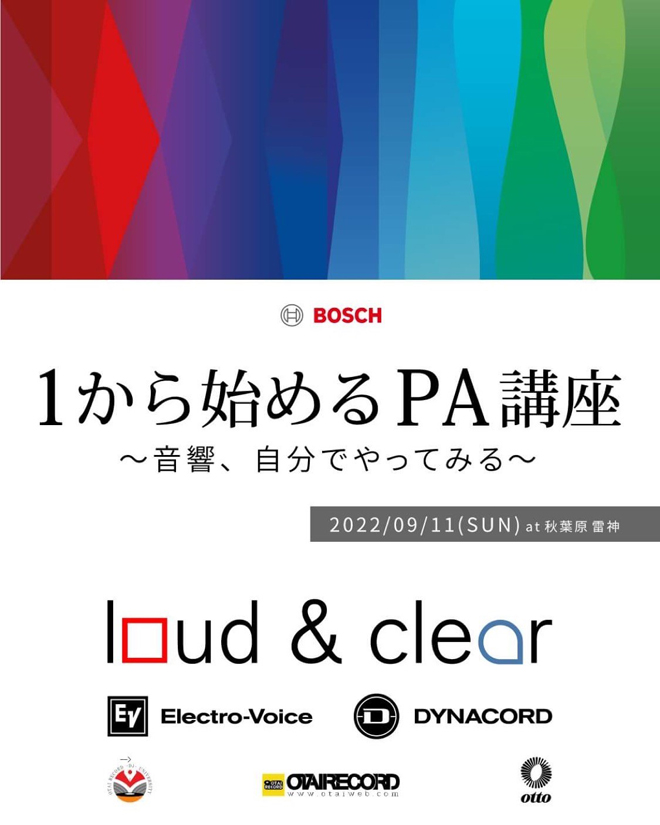 オタイオーディオ株式会社が運営する機材販売店OTAIRECORDは、ボッシュセキュリティシステムズ株式会社の有するPA機器世界的ブランド「Electro-Voice」「DYNACORD」と共に2022年9月11日(日)、「OTAI RECORD presents 1からはじめるPA講座〜音響自分でやってみる~〜supported by Electro-Voice ,DYNACORD」を開催する。