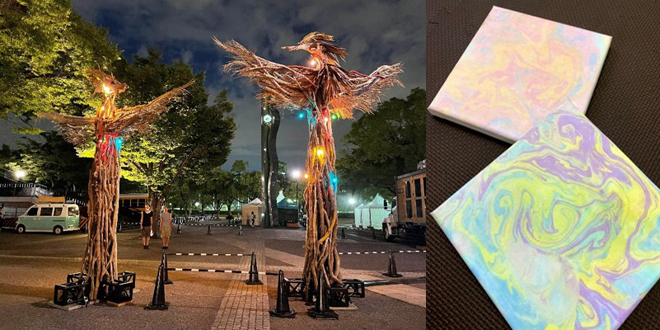 今回、アートを担当するのは庭師として活躍した後、世界を放浪中にオーストラリアで自然の素材を用いてアートと成す「ランドアート」に出会い開眼。アーティストへと転身したTreeGladness & Co./ KSK。彼の作品の材料となるのは、地球・大自然が生み出す“流木”。同じものはひとつとしてない流木を駆使し、動物や壮大なオブジェなど様々な形へと昇華。しかも、そこに電飾やライティングなど光を纏うとその存在感は一変し、時に優美に、時に雄大に、そして時に妖艶に見るものを魅了。その唯一無二の作品は多くのフェスや芸術祭で喝采を浴びてきたが、今回は竹芝の自然と相まり、どんな化学反応を起こすのか、ご注目を。アートを見て音楽を聴いて心を潤した後には実際に体験も。絵画技法のひとつであり、絵具を垂らすことで簡単に美しい幾何学模様が楽しめる「マーブリング」から夏の夜を素敵に彩ってくれるキャンドル制作、さらには洋服のプリントなどに用いられるシルクスクリーン体験など、会場内で様々なワークショップを開催。ここで今夏の思い出の一品を作ることが可能だ。