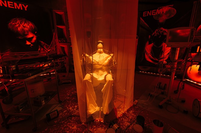 まず、屋外の階段を上って3階から入場すると、手術道具が散乱する不穏な空間へ。ここは今年3月にリリースされた楽曲「ENEMY feat.Kamui」の世界観を表現したものだ。ベールに覆われ拘束されたマネキンが着ているのは、MV撮影時に山中拓也が着用した衣装。
