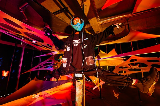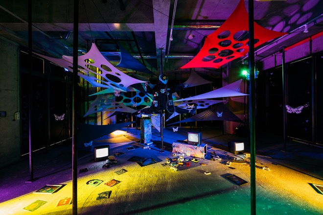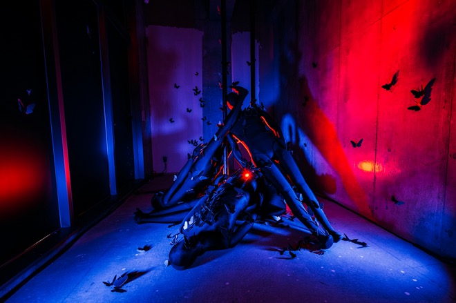 黒い蛾がたかる階段を下りて2階へ進むと、8月10日リリースの新曲「BUG」の世界観が広がり、同日に公開されたMVの雰囲気をいち早く体感することができた。ティーザーをチェックしていた人であれば、宙に浮くマネキンの衣装がティーザー内で山中が着ていた衣装と同じだったことに気づいただろう。