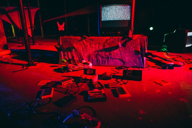 画面が砂嵐になったテレビ、床に散乱したゲーム機、ゲームソフトなど、その他の小道具も「BUG」の世界を表現している。フロアの一角には蛾の絵が飾られていたほか、蛾に蝕まれ真っ黒になったマネキンが複数体重なり合いながら倒れている。これらは何らかのメッセージを示唆するものだろうか。