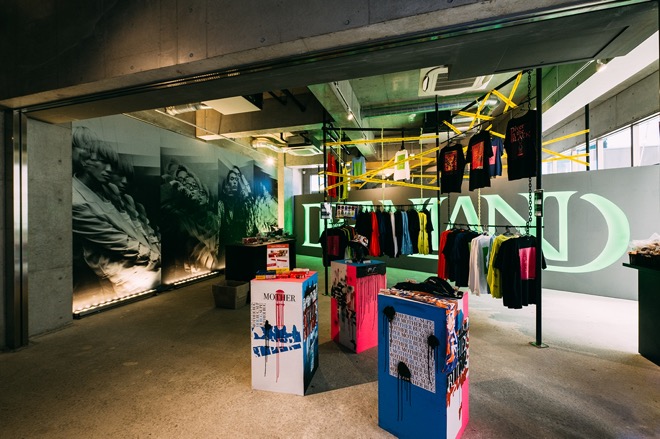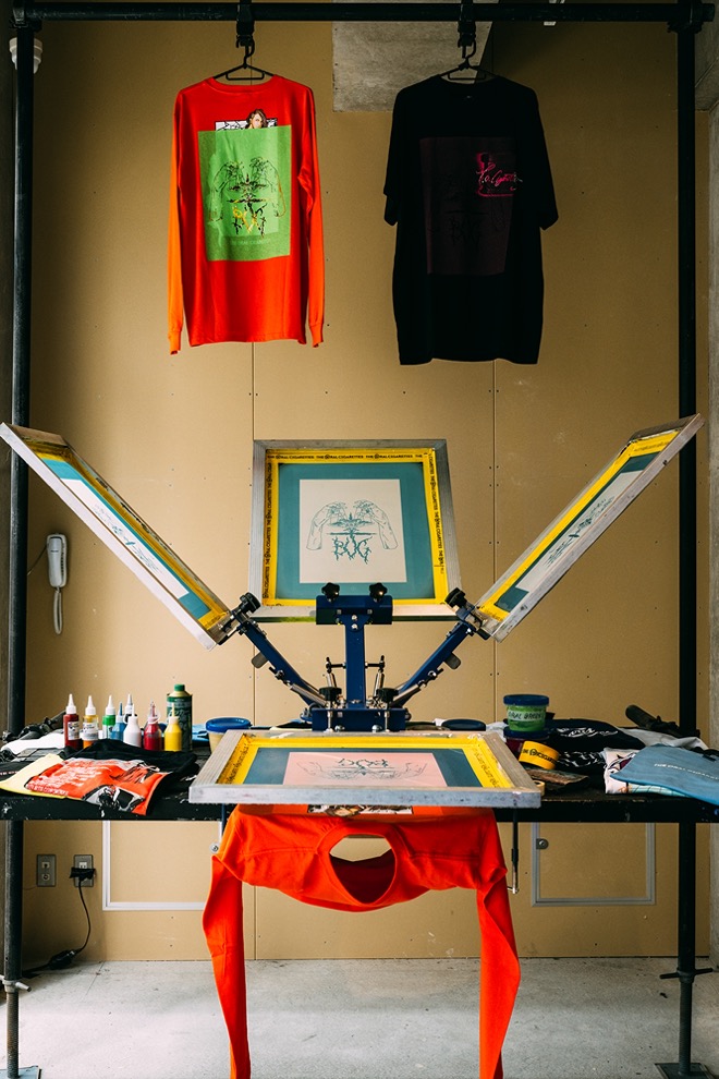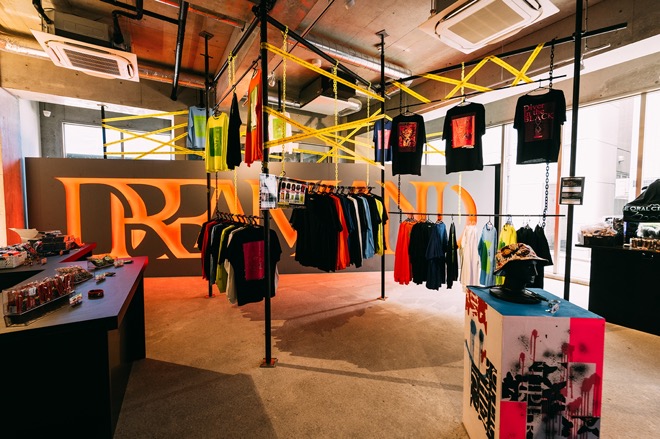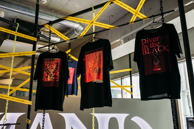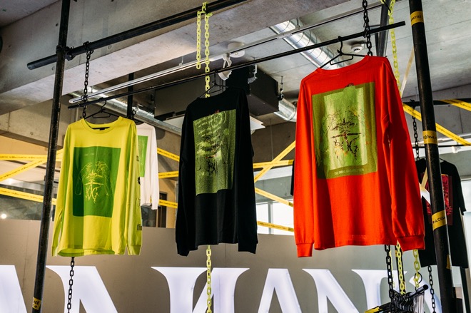 1階はショップになっていて、過去のグッズに再加工を施したTシャツ「BUG OVER SILK PRINT WEAR」や、CBDブランドDawg.とのコラボレーションVAPE PENをはじめとした、限定グッズが販売されていた。