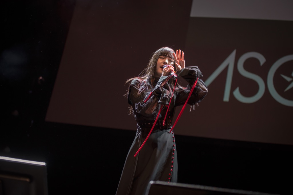 ステージのトップバッターを務めたのは、ASCA。今年既にアメリカのアニメコンベンション<Kawaii Kon>や<Anime Boston>など数々の海外イベントに出演を果たしているASCAだが、ヨーロッパでのイベント出演は今回が初。数々の人気アニメタイアップ楽曲の中から、「RESISTER」(TVアニメ『ソードアート・オンラインアリシゼーション』オープニングテーマ)、「Howling」(TVアニメ「魔法科高校の劣等生 来訪者編」オープニングテーマ)などを含むアップテンポなナンバーを披露し会場を盛り上げた。