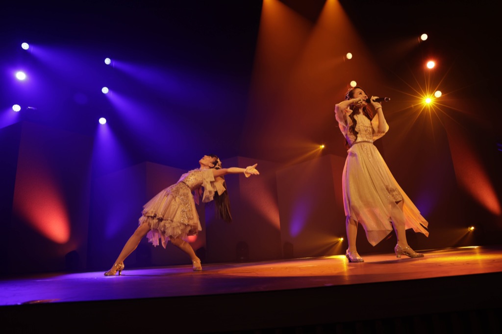 メンバーカラーのパステルピンク(クララ)とパステルグリーン(カレン)の2色のペンライトが会場を埋め尽くす中、レトロフューチャー感溢れるClariSの新境地「Twinkle Twinkle」からライブはスタート。黄色とゴールドを基調とした大人びたドレスと相まって、12年目を迎え新たなステージへと駆け上がる、現在のClariSを象徴する、力強い雰囲気の中ライブはスタートした。