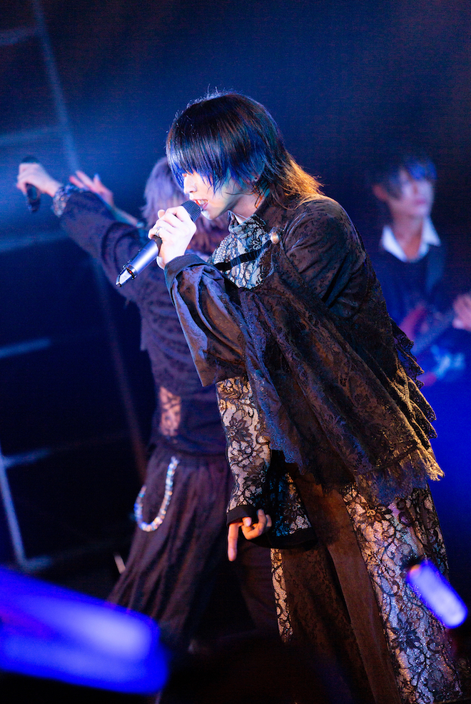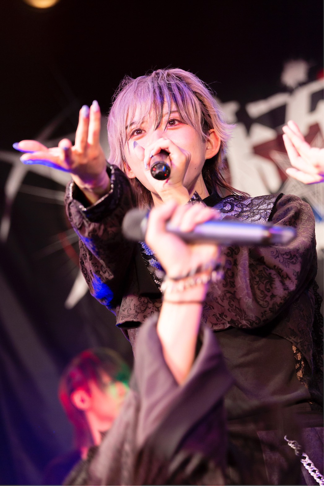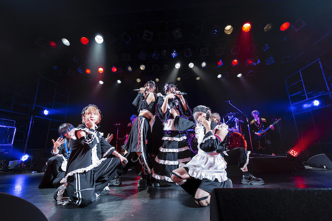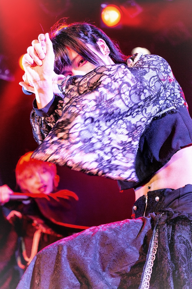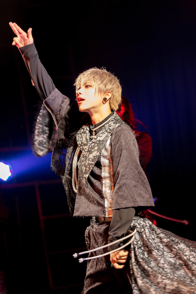 そこから1stシングル収録曲「救済バタフライ」「Call of Destiny」、和テイスト強めの「月詠センチメンタル」「千年恋歌-五月雨-」と、新旧織り交ぜた多彩な楽曲をオープニングから惜しみなく畳み掛けていく。歌もダンスも前回のワンマンよりパワーアップしており、メンバー各々の魅せ方、自分が最も格好良く見える姿が研究されている感じが伝わった。さらに、曲の中で最も盛り上がるポイントに、全員のエネルギーを集中させることで、ステージングにメリハリや迫力が出ていたところも良かった。恐らく、彼らのこれまでのライブの中でもかなり好調な滑り出しだったのではないだろうか。