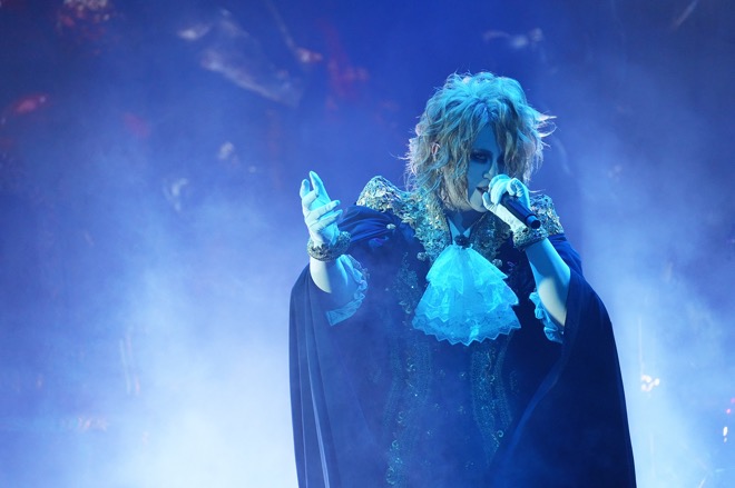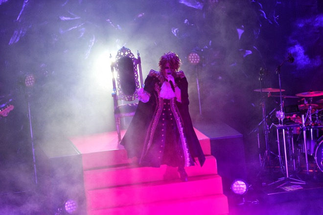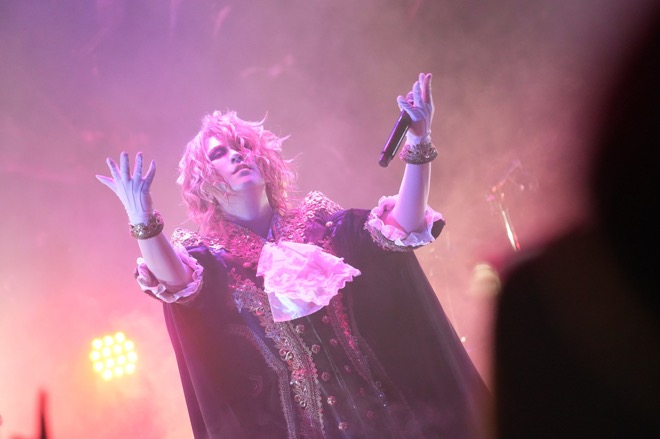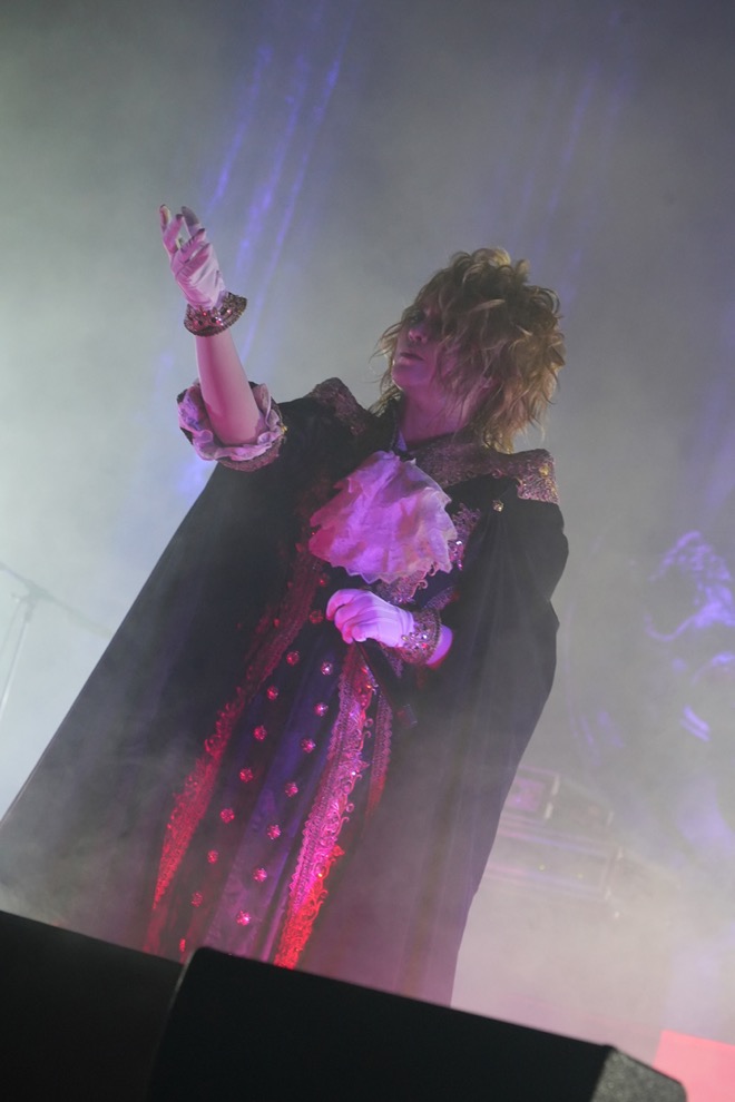 その狙いは序盤から明らかだった。時を告げる鐘の音に始まる耳慣れないオープニングSEが流れ、左右に幕が開くと、すでにメンバーはステージに。KAMIJOは後方上段の玉座に座り、そのまま「Heart」が始まった。8分を超える長編をこの位置に据えたことは、劇的なライヴを繰り広げていくことの宣言である。加えて見逃せないのが、これが2014年に発表された1stフルアルバムのタイトルトラックであり、KAMIJOが綴ってきたルイ17世にまつわる物語の重要な場面を描く楽曲であるということだ。ここに続いたのが、サンジェルマン伯爵の証言をテーマにした「証言」であるのも合点がいく。