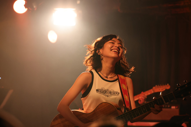 武田舞彩がステージイン。「みんなで楽しんでいきましょう」の一言とともに、「DESIRE」「ブルーに生まれて」とライブはスタートしていく。タイトなドラムにグルーヴを描くベース、さらにエレキギターの甘いトーンが、武田舞彩のボーカルをよりドラマチックに彩る。「Truth Proof」や「東京」といったこれまで弾き語り形式で耳にする機会が多かった楽曲も、ライブなサウンドへと変貌。観客は新しい音に身を委ねて、リズムに身体を揺らしたりクラップで応える。そんな様子を目にして、武田からは思わず笑みが溢れていた。