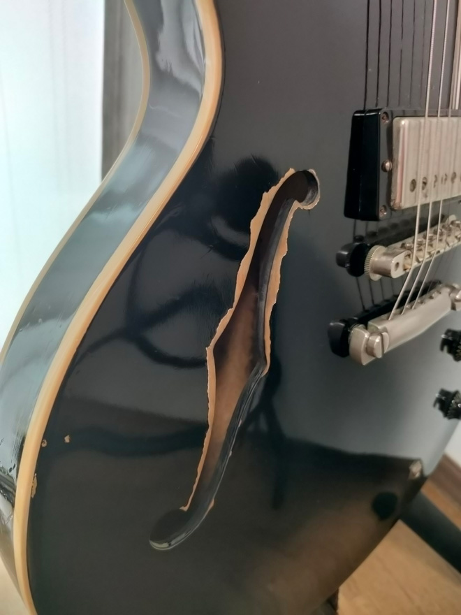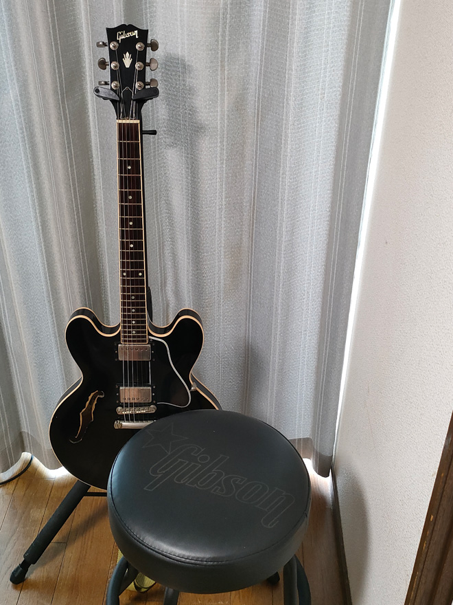 リッケンへの思いが心の何処かにありながらも335を愛でる思い…これは男性の恋愛事情にも重なるところがあるのでしょうか。なんちゃって。なかなか貫禄の335ですが、fホール周りってこんな感じにラッカーが剥がれるんですね。スツールがまたいいなあ。ここに座るだけでお酒の味が変わるよなあ。(JMN統括編集長 烏丸)