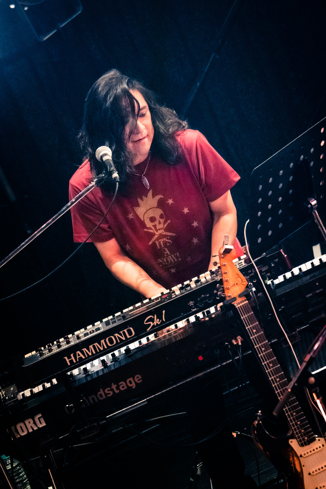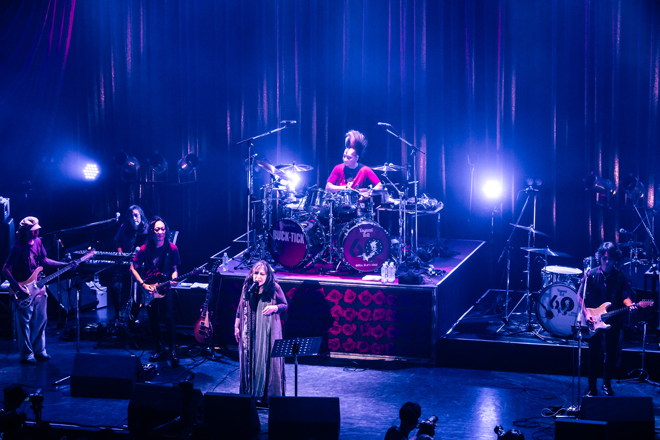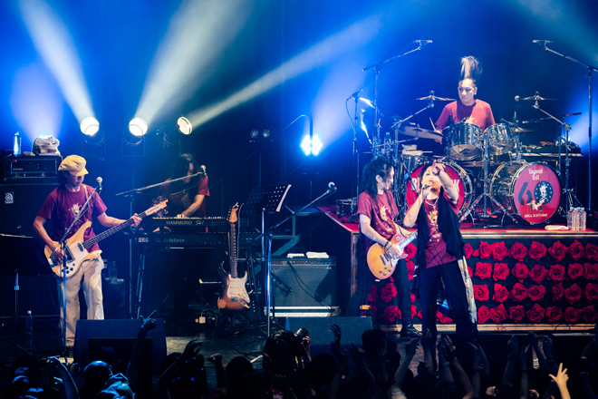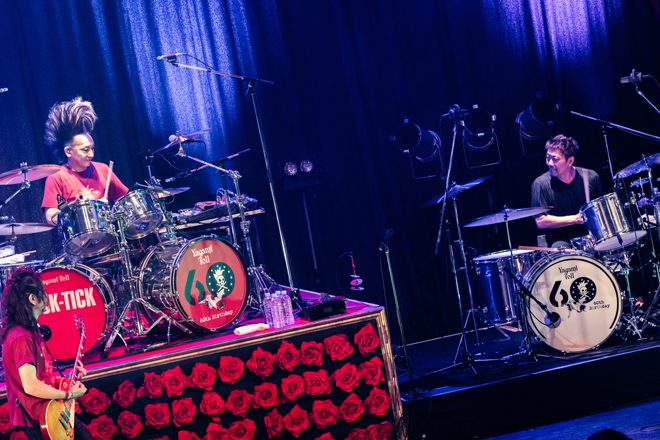 2番手はYagami Toll & Blue Sky。ステージにセットされたドラム台は、真っ赤なバラが飾られた特別仕様。ヤガミ、原田喧太(G&vo)、KANAME(B&vo)、屋宜昌登(G)、都啓一(key)の5人が揃いの赤いTシャツで登場すると、インストナンバー「WONDERFUL HOME -Thunder & Cold wind-」をセッション。芳醇なアンサンブルで観客を引き込んだ後、「SODA ROCK!!」や「ROCK’N ROLL STAR」など軽快なロックンロールナンバーで会場を盛り上げた。このバースデーライヴ「IT’S A NOW!」には、もう一人欠かせないメンバーがいた。今年3月に逝去したSHIMEへの哀悼の意を込めて、SHIMEのオリジナル曲「Top of The Mountain Bar」をカヴァー。スクリーンには彼らと一緒に歌い演奏するSHIMEの姿が映し出され、時折それを見ながらドラムを叩くヤガミの姿が印象的だった。続いてゲストドラマーの湊雅史とキャロルの「ファンキーモンキーベイビー」「グッド・オールド・ロックン・ロール」の2曲を、高橋まこととはビートルズもカヴァーしたラリー・ウィリアムズの「SLOW DOWN」とBOØWYの「DREAMIN’」を、ツインドラムの形でセッションした。そして、ヤガミが大ファンだと公言する吉田美奈子は、ヤガミからのリクエストで「時よ」「夢で逢えたら」を熱唱。そのグルーヴィーなヴォーカルの余韻に浸っているところに、ケーキを運ぶヤガミの実弟、樋口豊(B/BUCK-TICK)と、大きな花束を抱えたTetsu(D’ERLANGER)の登場。会場は一気にお祝いモードに。和やかな雰囲気の中、辛口のSHIMEが唯一褒めてくれたというミディアムナンバー「Blow Wind」で締め括った。
